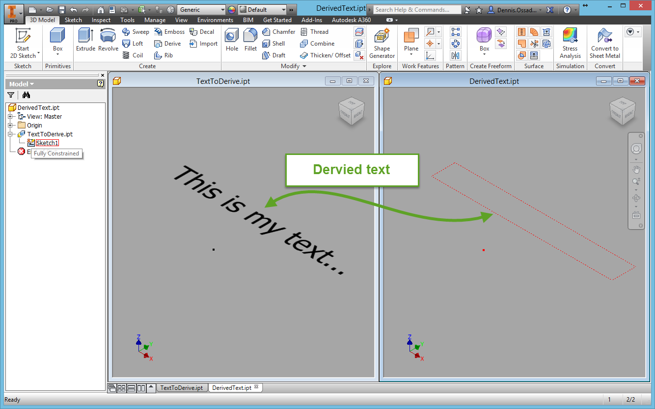 Inventor Sketched text cannot be derived Inventor, However, sketch geometry can be copied to clipboard from the source sketch and pasted into the destination sketch (a sketch on the destination view must be created first). That doesn�t satisfy this portion of the problem statement, future modifications in all parts at the same time. derived components (master/skeletal) modeling is the solution. > alan > > > alan k..
